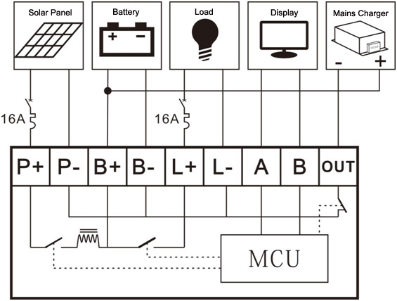 5. Load output port with over/under voltage and over current protections, if solar voltage is too low (night), load will start output.